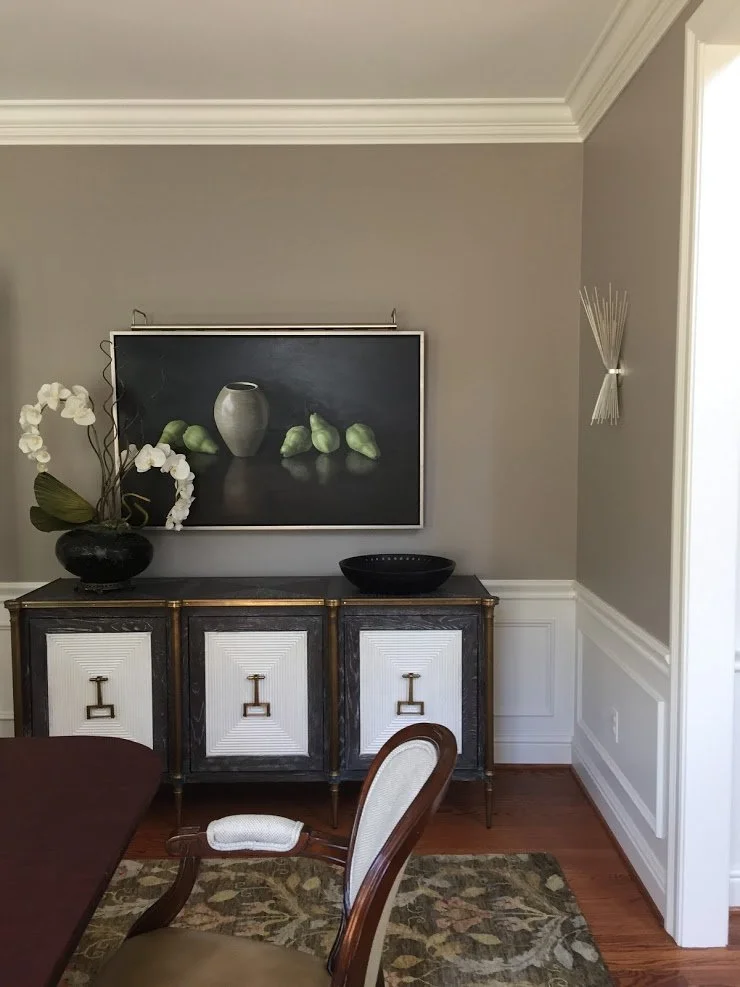After: A richly layered dining space that feels both grounded and graceful. The interplay of neutral tones with architectural detail brings focus to the art, furniture, and the overall mood of the room.