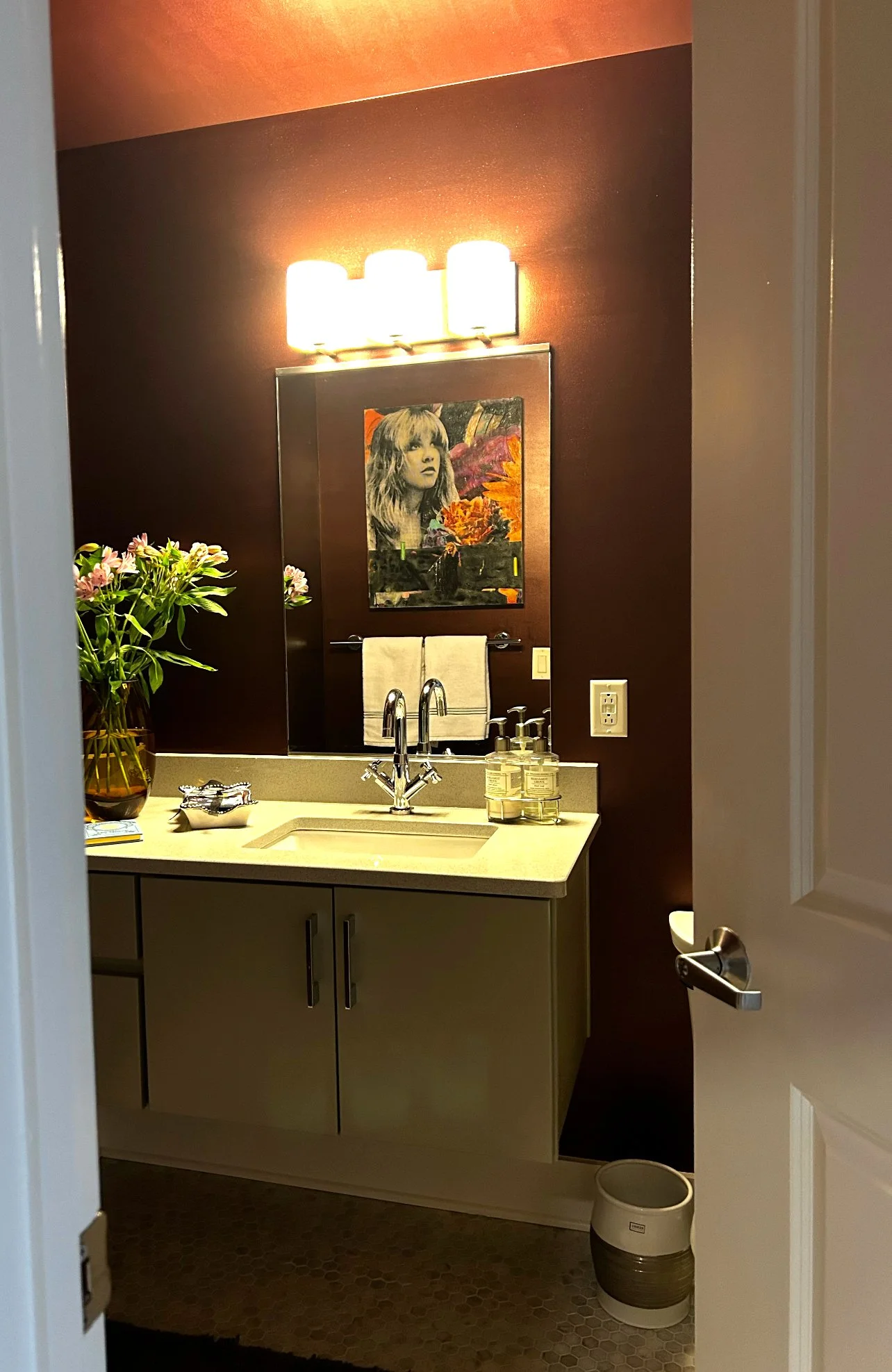 Materials Used: Specialty metallic wall paint, custom-blended for a warm cherry sheen; encaustic wax, pigment, and photo layers for original artwork; glass vase and styling accessories curated to echo the warmth of the finish.