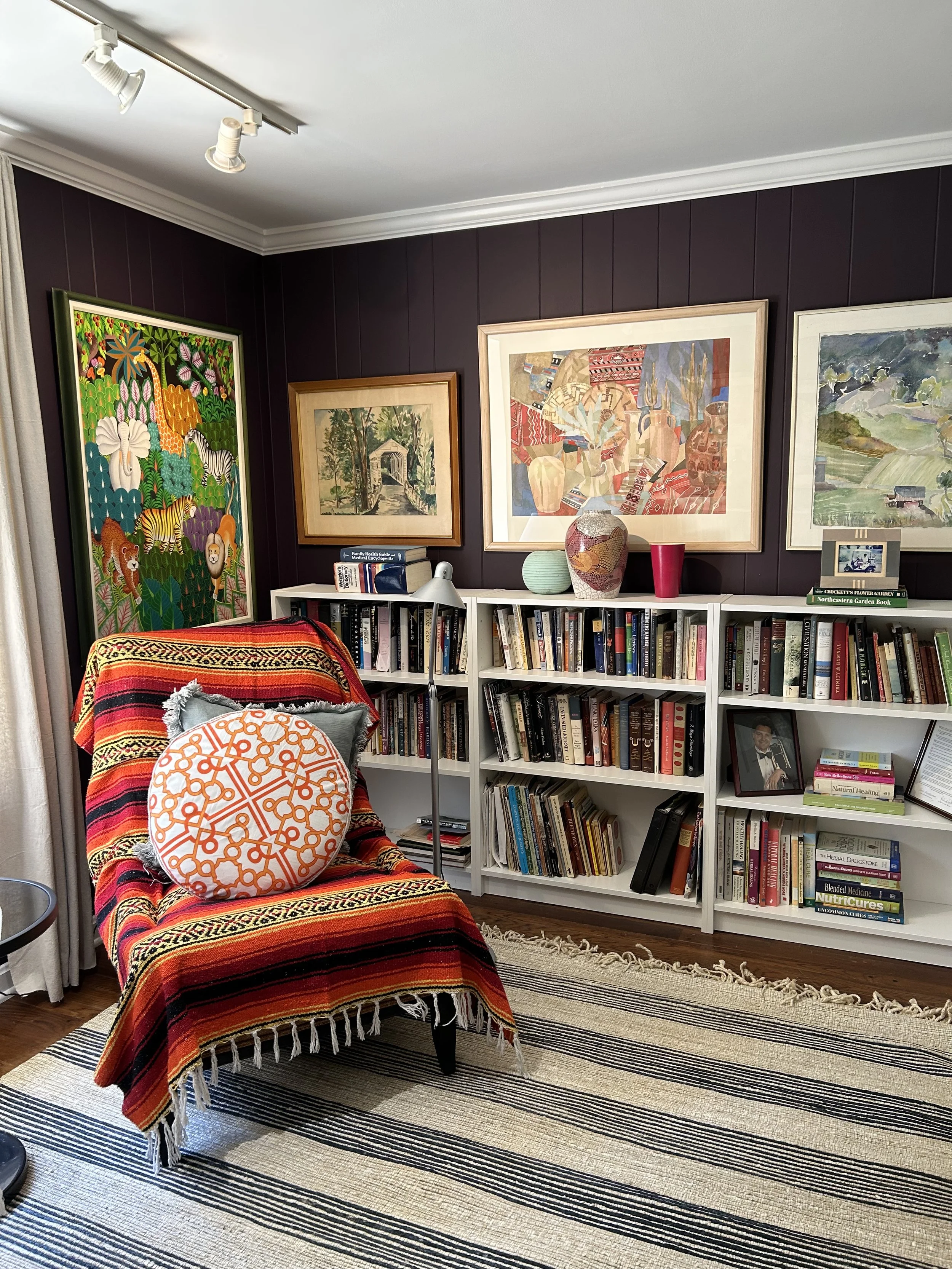 Scope: Wall and ceiling painting, custom drapery design and fabrication, artwork curation and installation, bookshelf organization, and room reimagining from music space to personal library.
