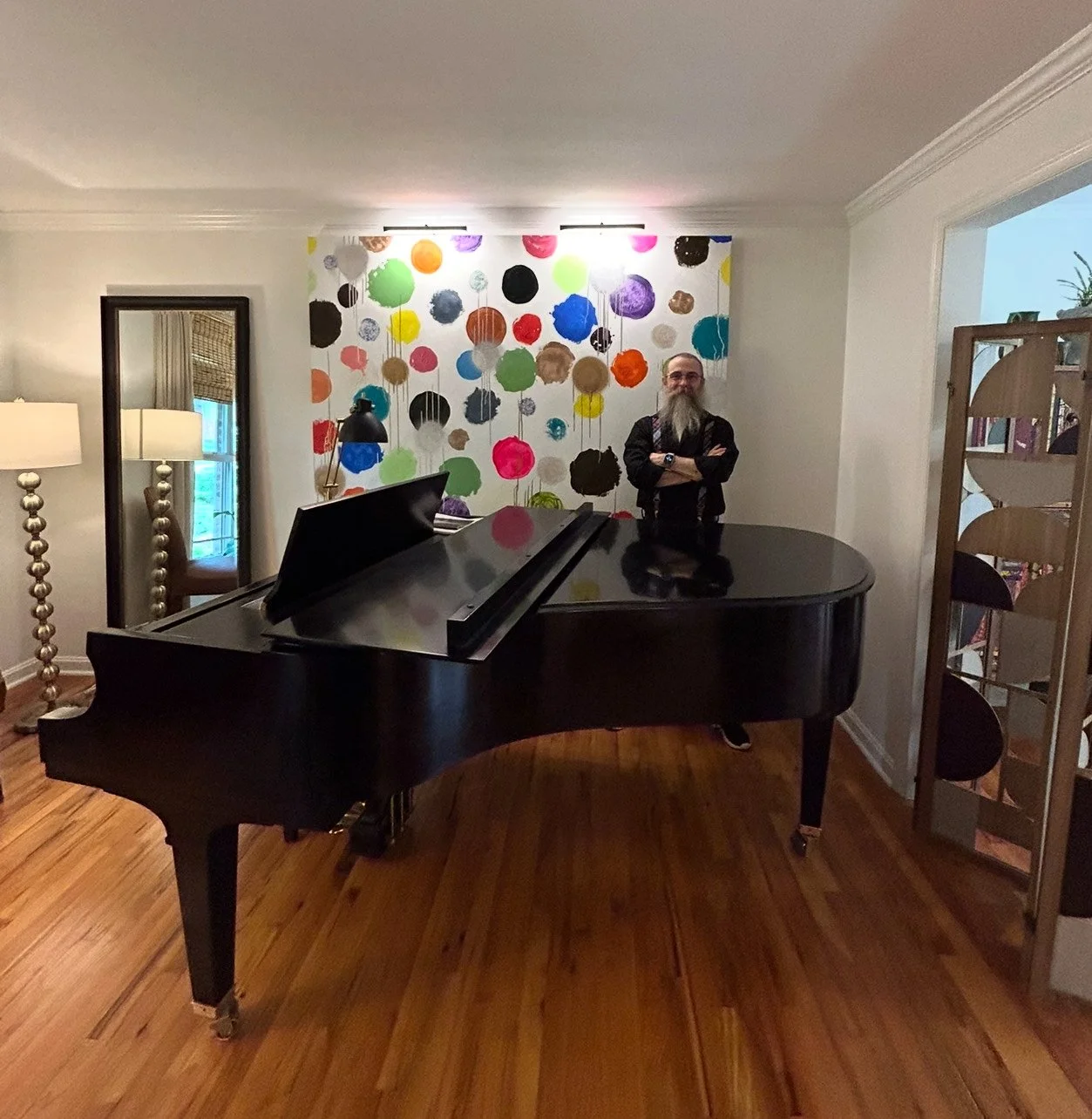 Features: Warm-toned refinished floors, piano repositioned for flow and acoustics, original art as focal point